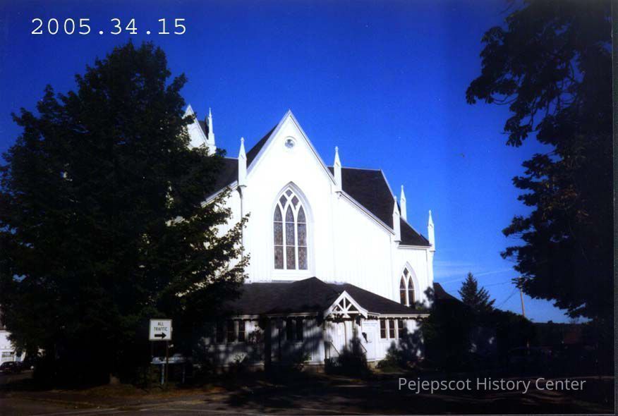 A color photograph of the back of the First Parish Church, showing the Chamberlain window. See 2005.34.15.a for negative.