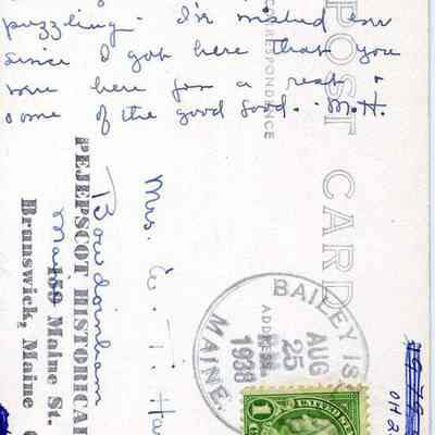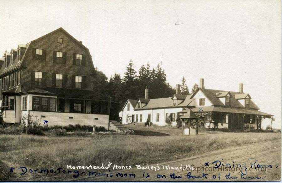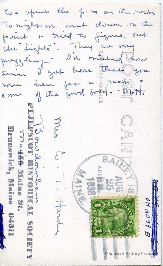 B/W postcard of the Homestead and Annex, Bailey Island, Harpswell, with comments on the front and a message to Mrs. E. T. Hardie on the back. Postmarked 8/25/1938.Lexicon