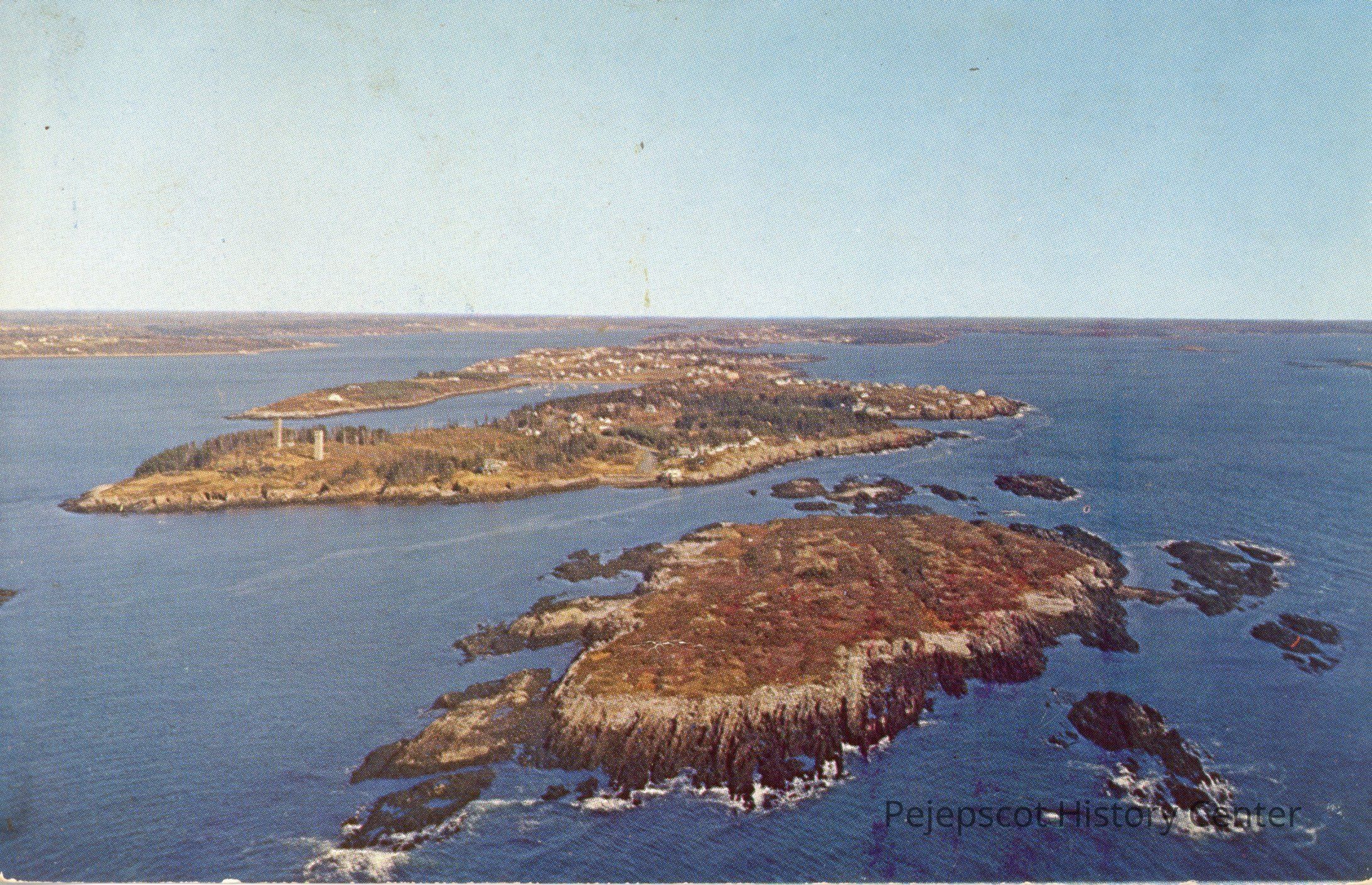Color aerial photo postcard of rugged Jaquish Island in the foreground, Land's End, Mackerel Cove, South Harpswell and Stovers Point upper right and Orr's Island, upper center.Collection