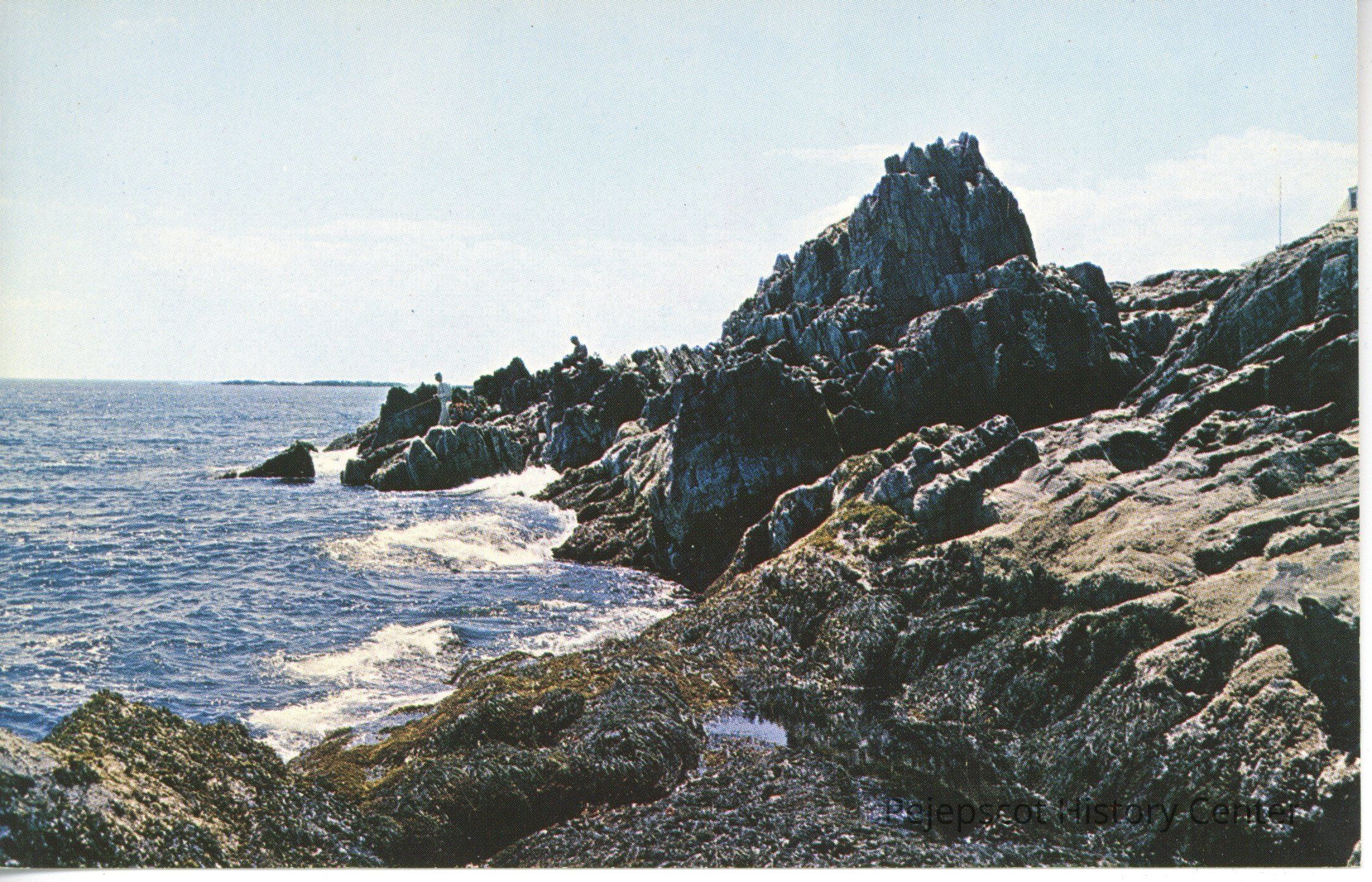 Color photo postcard of the famed Pinnacle Rock on the southeast shore of Bailey Island, favorite spot for fishermen and sightseers.Collection