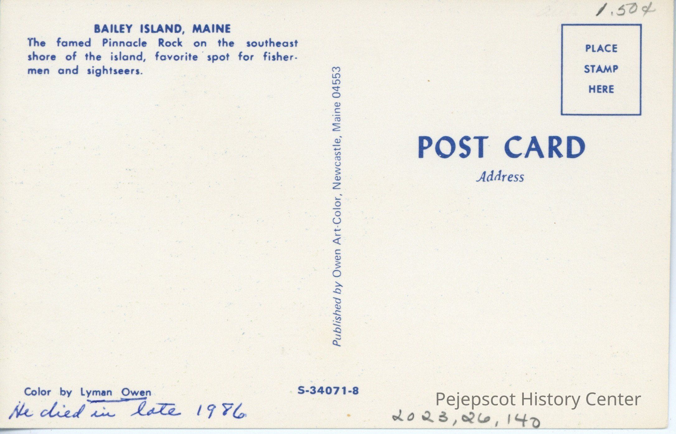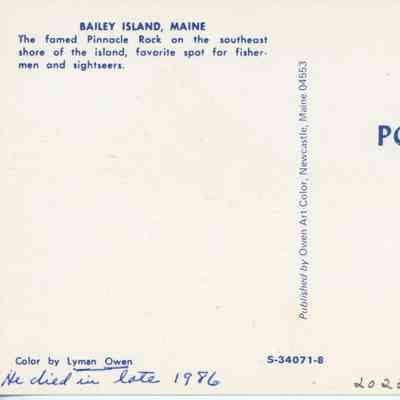 Color photo post card of the famed Pinnacle Rock on the southeast shore of Bailey Island, favorite spot for fishermen and sightseers.Collection