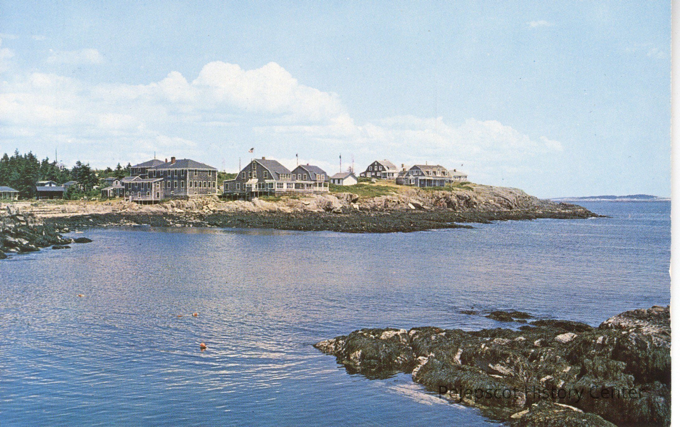 Color photo postcard of Bailey Island, Maine, looking across Little Harbor toward Driftwood Inn with Ragged Island in the distance.Collection