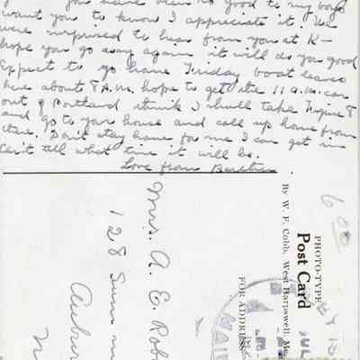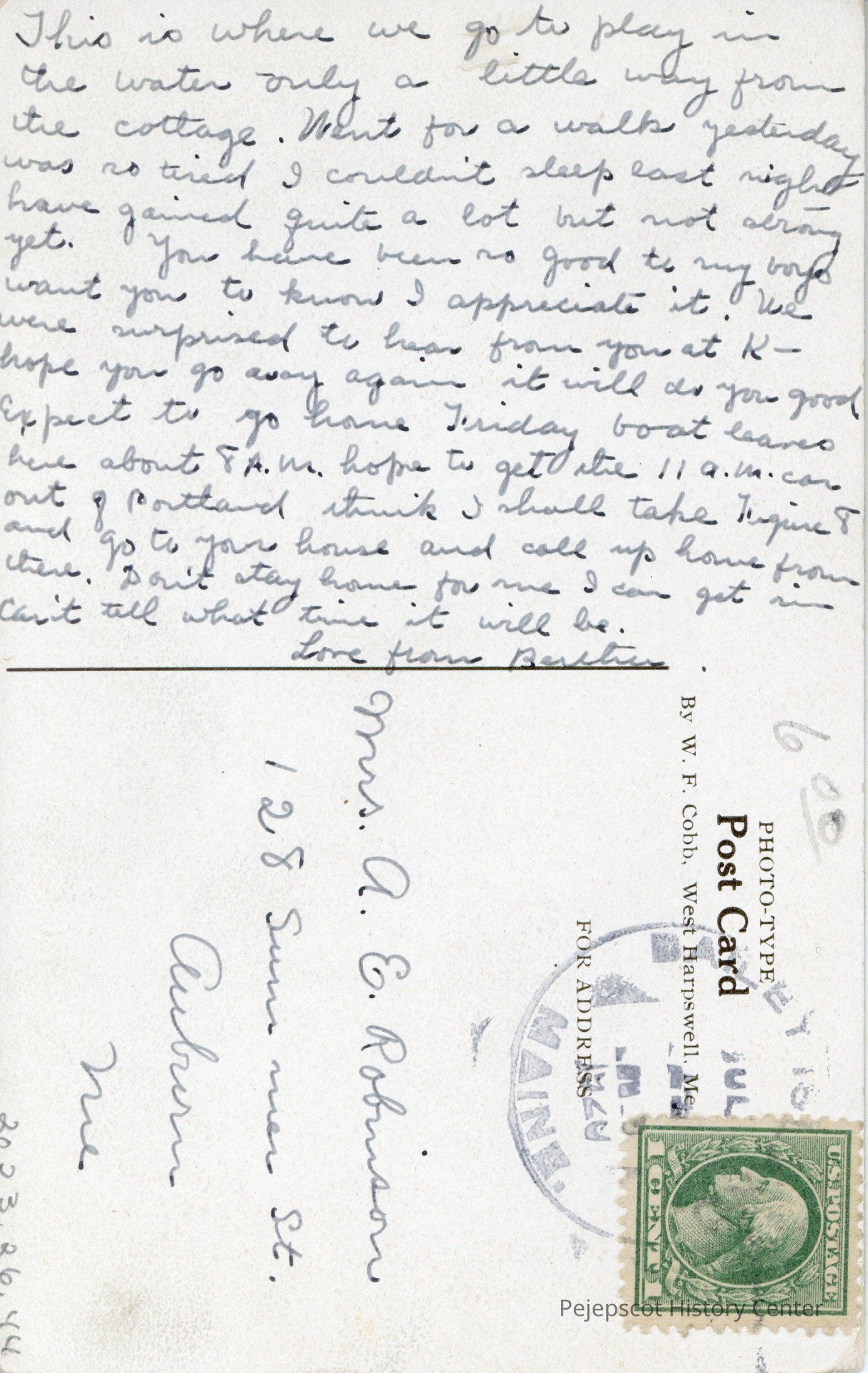 This is where we go to play in the water only a little way from the cottage. Went for a walk yesterday was so tired I couldn’t sleep last night have gained quite a lot but not [?] yet. You have been so good to my boys want you to know I appreciate it. We were surprised to hear from you at K - hope you go away again it will do you good. Expect to go home Friday boat leaves here about 8 A.M. hope to get the 11 A.M. car out of Portland think I shall take [?] 8 and go to your house and call up home from there. Don’t stay home for me I can get in. . Can’t tell what time it will be . Love from Bertha[?]