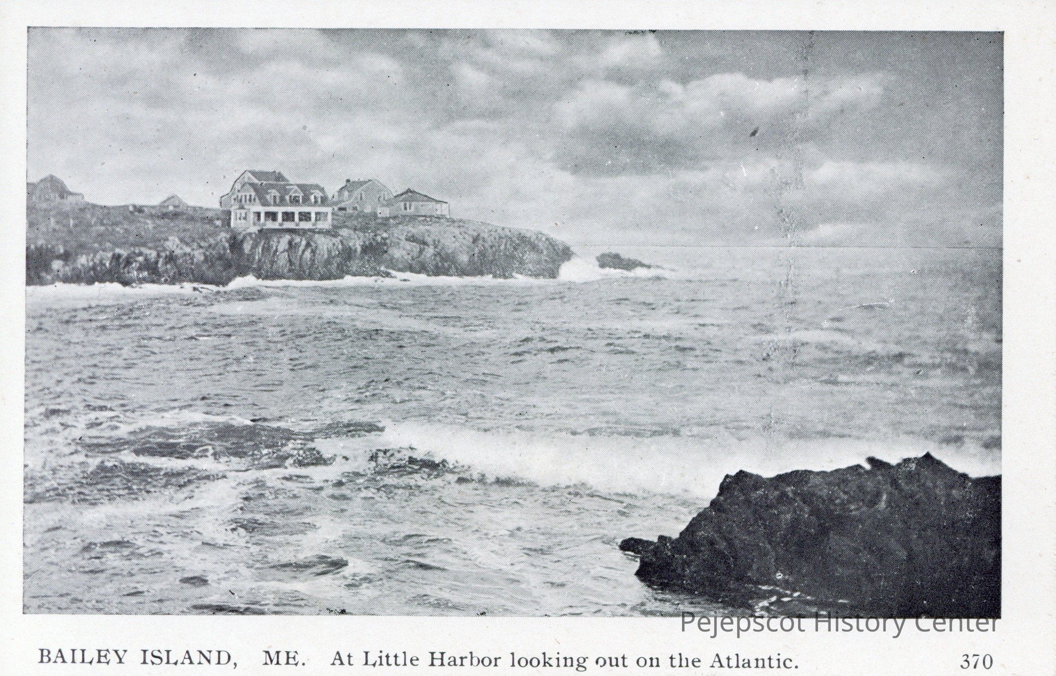 Black and white photo postcard of Bailey Island, Me., at Little Harbor, looking out on the Atlantic.Collection
