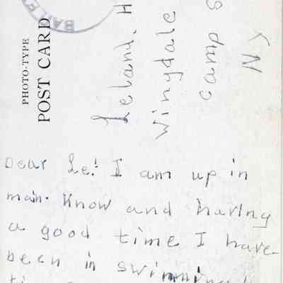 Dear Le! I am up in main know and having a good time. I have been in swimming 4 times but it’s cold. I shall close with Love, Sister