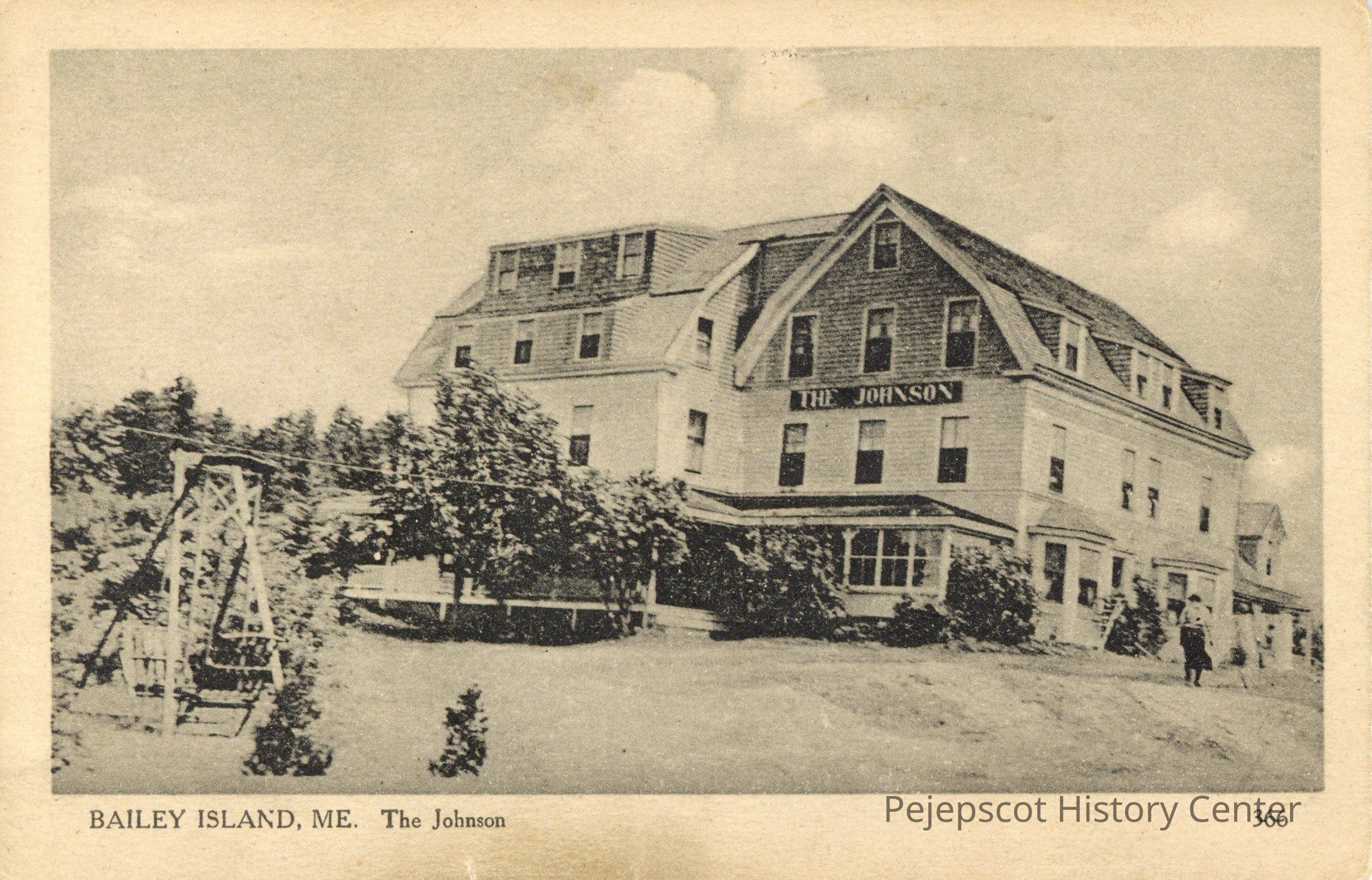 Black and white photo postcard of The Johnson House on Bailey Island, ME.Collection