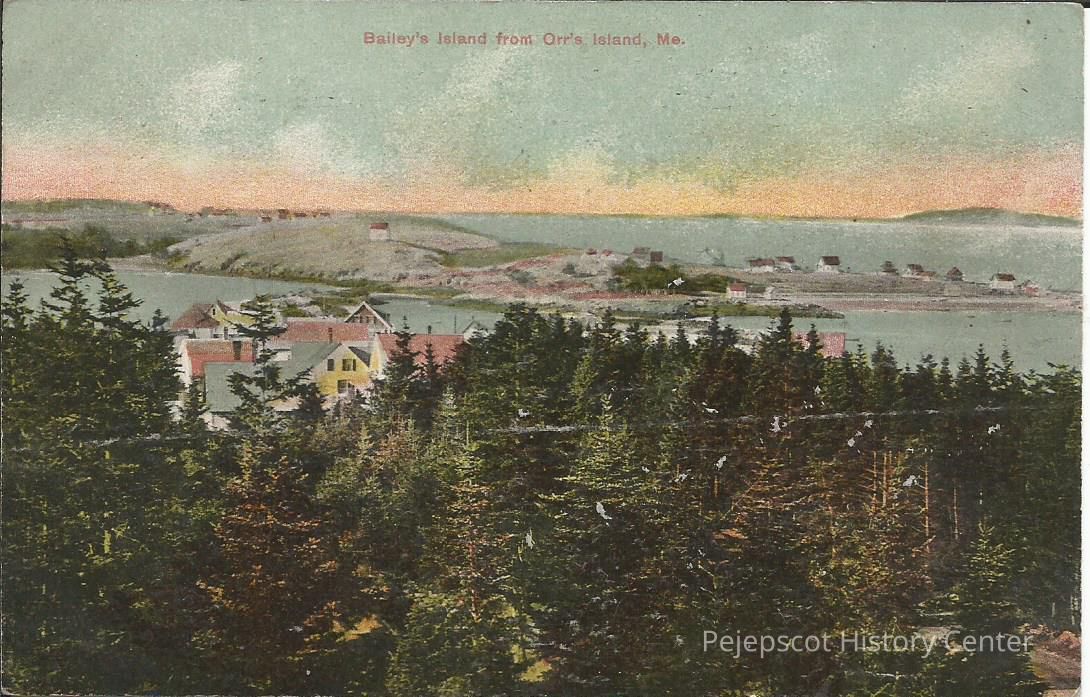 A color picture postcard of Bailey's Island from Orr's Island, ME. The card is addressed to Mrs. H. G. Rowe, Chandlers Mill, Box 48, New Gloucester, Maine, sent from Mrs. Clark. It is postmarked and has a 1 cent stamp attached. Dated 08/1/1910.Lexicon