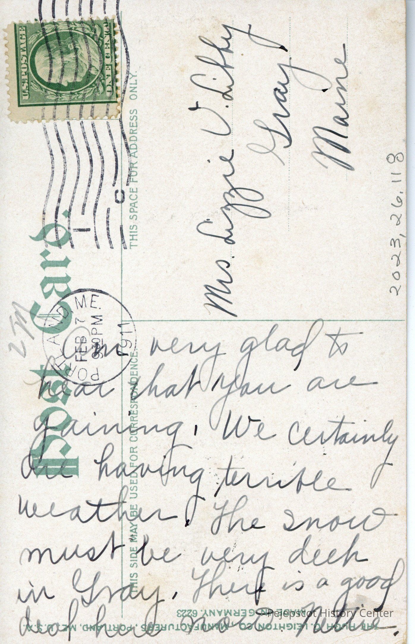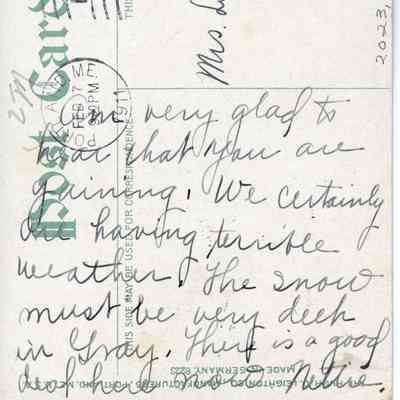 Am very glad to hear that your are gaining. We certainly are having terrible weather. The snow must be very deep in Gray. There is a good deal here now. Nettie