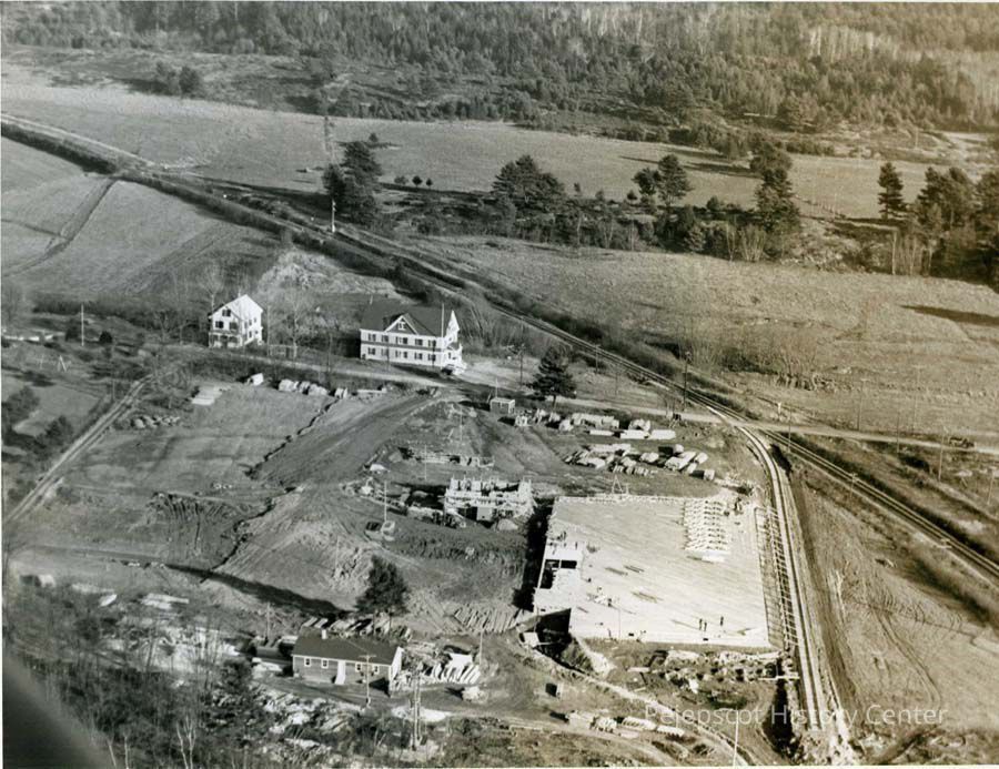 A B/W aerial photograph of the Bakelite Plant, West Bath, Maine under construction. Became Bissons in the 1990s. West Bath Grange is in center of picture. Undated