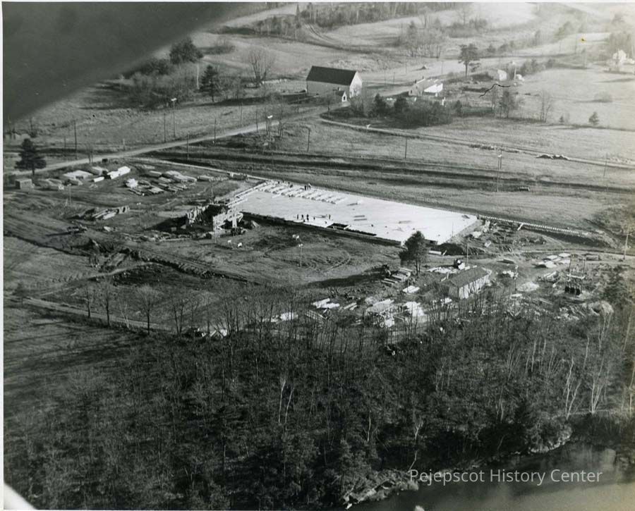 A B/W aerial photograph of the Bakelite Plant, West Bath, Maine. Became Bisson Moving & Storage in the 1990s. Undated.