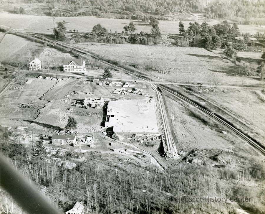 A B/W aerial photograph of the Bakelite Plant, West Bath, Maine under construction. Became Bissons in the 1990s. Undated.