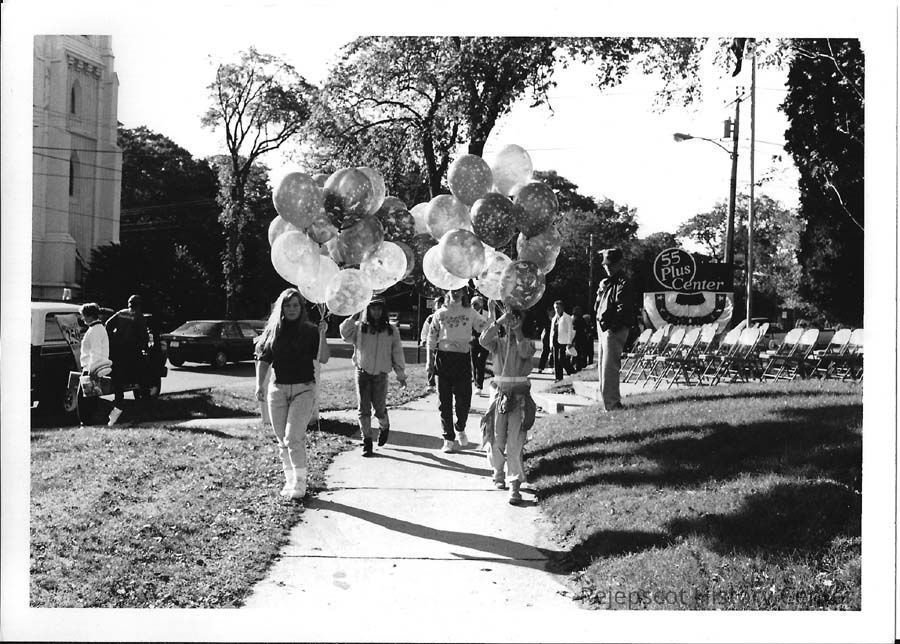 A B/W photograph of Brunswick's 250th Anniversary Parade on Maine Street in front of the "55+" Center showing people selling balloons. The 55+ Center later became People Plus and moved into the Union Street School when the Inn at Brunswick Station puchased the old church on the site and tore it down.