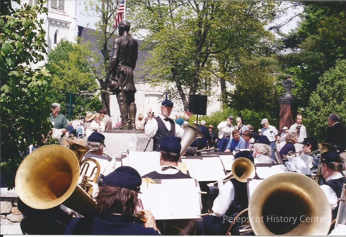 A color photograph of a band playing for onlookers behind the Joshua Lawrence Chamberlain statue during its dedication in Brunswick, ME. Undated.
