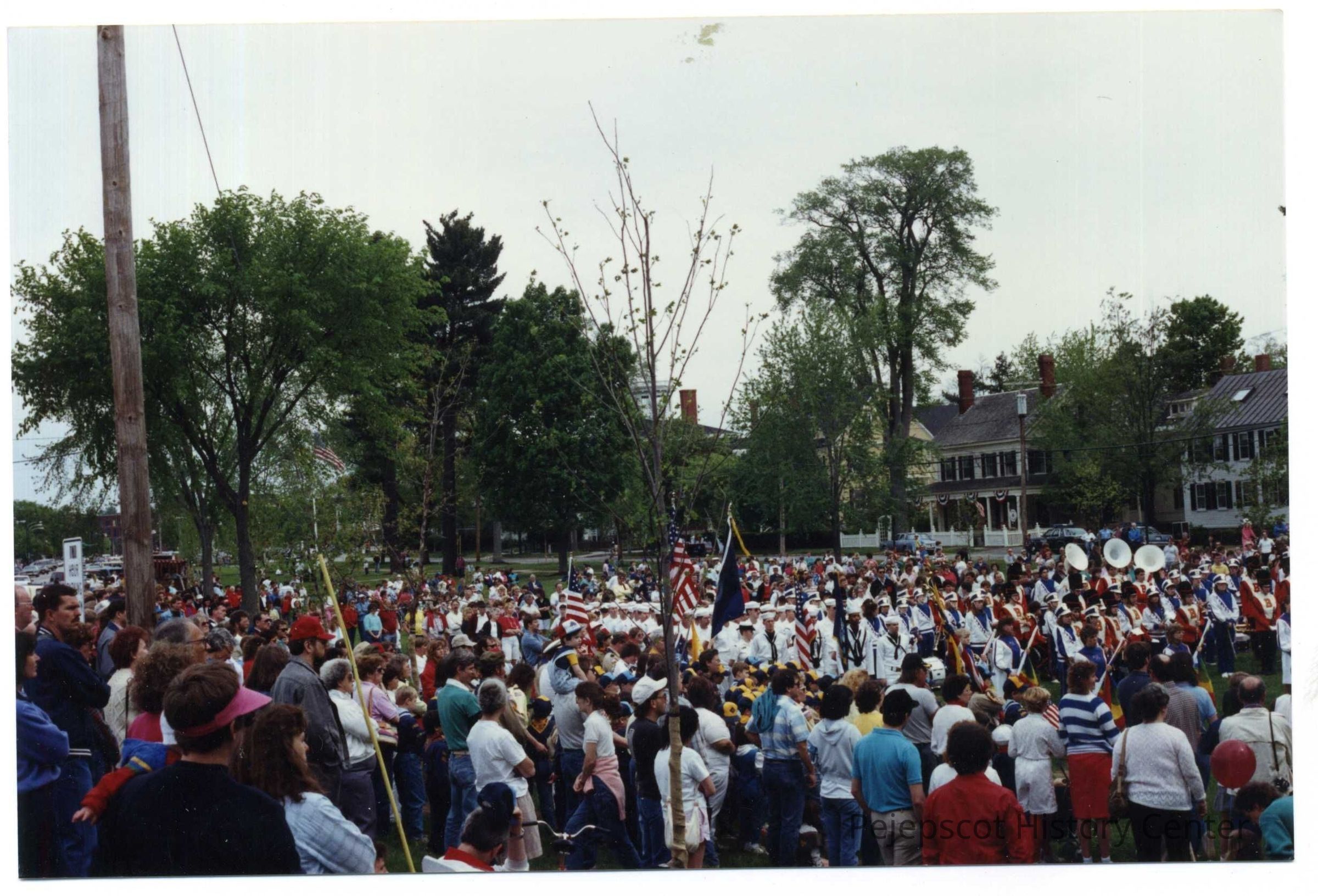 A color photograph of bands, color guards and the crowd on the Brunswick green at the Desert Storm Welcome Home parade.