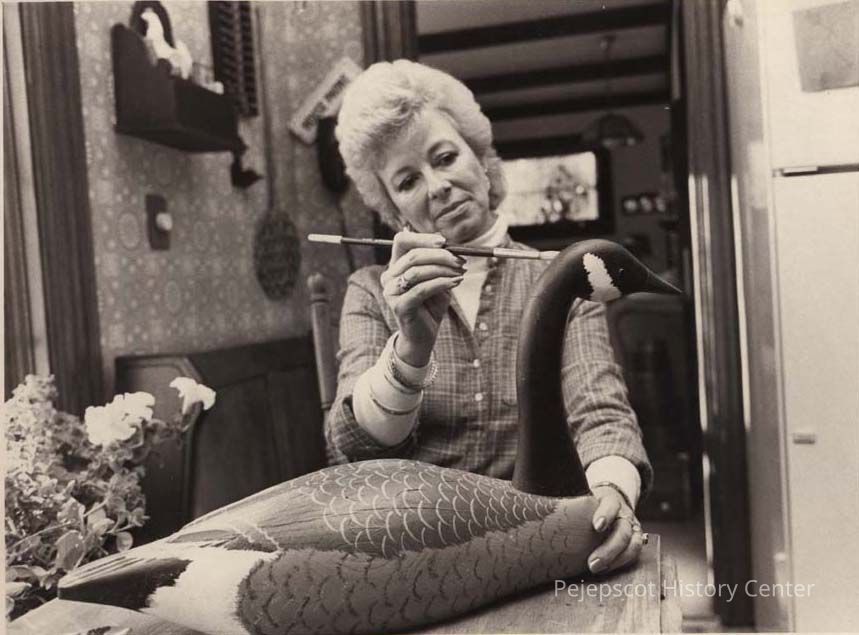 Decoys, specifically duck decoys, were originally used as a hunting tool by Indigenous Americans. Colonists in the 18th and 19th centuries picked up the tactic. Now decoys are not used for hunting so much as a folk art pastime. Barbara Boyland (1935-) of Bath, ME, is seen painting a large Canada Goose decoy in this photo. Boyland continues to paint decoys in remembrance of her late husband and his love of hunting, staying connected to him through the process despite his passing.
