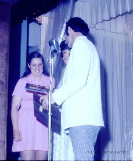 A 35 mm color slide of Barbara Theberge, Doris Bernier, a former winner of the pageant, and Gene Gagne during the 1973 Miss Teen Queen Pageant. The slide is not marked. Undated