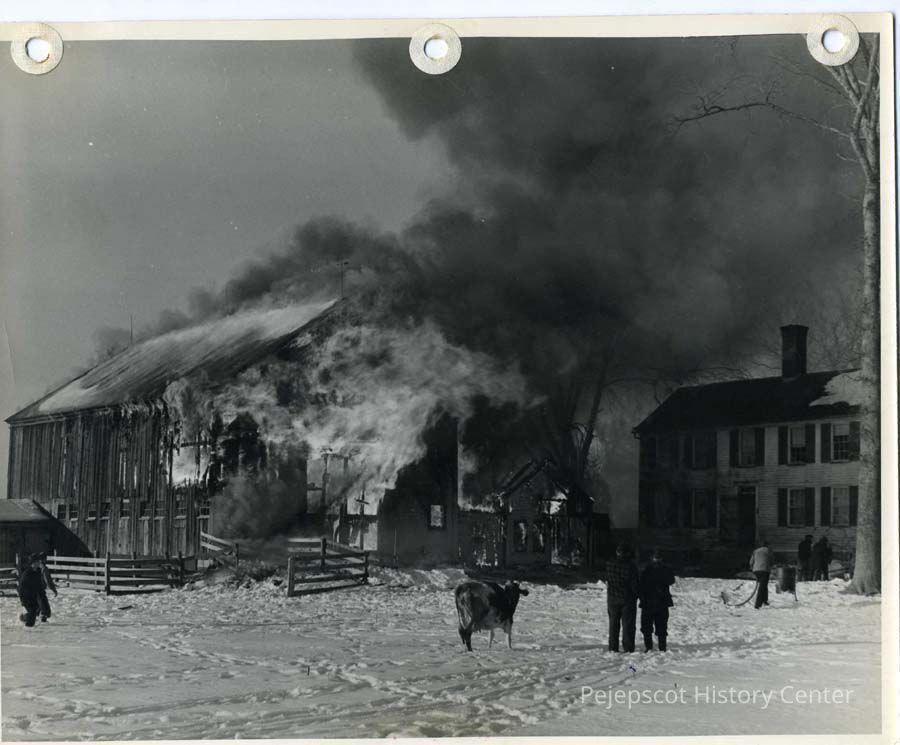 A black & white photograph of a barn fire at Skolfield house on Harpswell Road, Harpswell, ME. People and animals can be seen surrounding the fire. Dated Feb. 1, 1941.