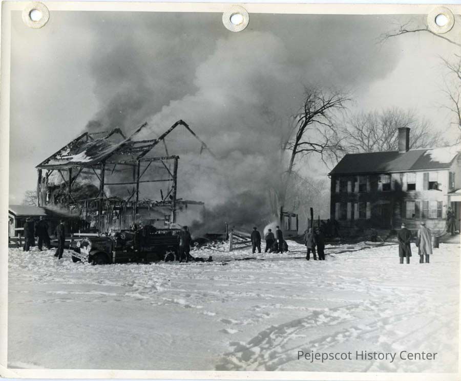 A black & white photograph of a barn fire at the Skolfield house on Harpswell Road, Harpswell, ME. The structure has been engulfed by the flames and barely stands as people look onward. Dated Feb. 1, 1941.