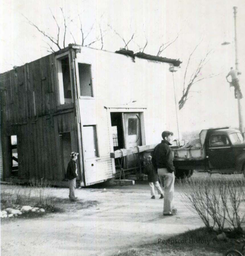 B/W photo of Bob's Barn (originally Dr. Elliot's) being moved from Maine Street, Brunswick, ME, to Jordan Avenue where Frank & Emma Babineau used it to make Bob's Potato Chips. Spring 1950