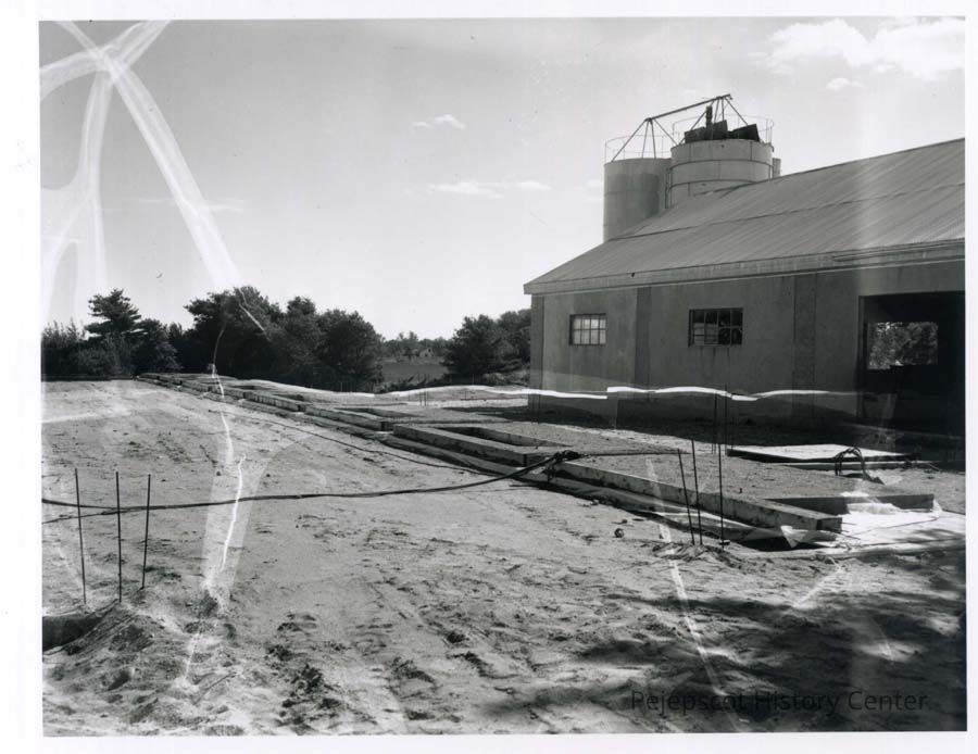 B/W Photo of a part of a barn and pre-cast concrete panels at Bert Dionne's farm, Pleasant [illegible] Rd.
