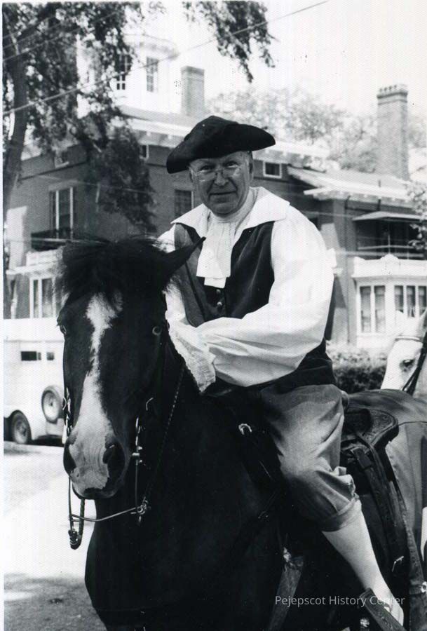 A B/W photograph of Barret Parker in costume and on horse back at the Brunswick Maine US Bicentennial Celebration. 7/4/1976.