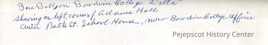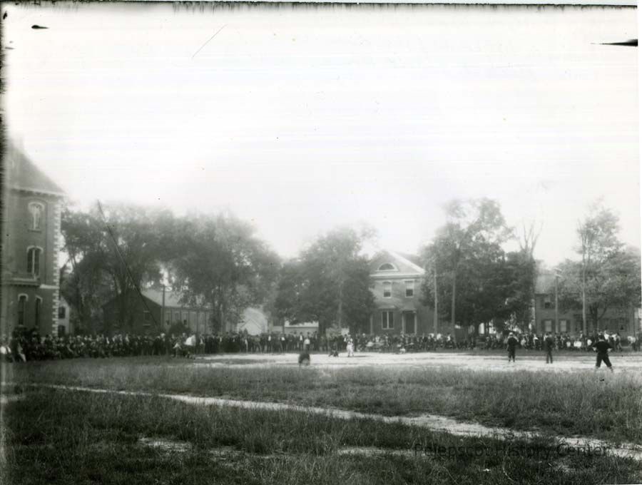 A B/W photograph of baseball being played on Bowdoin College "Delta." Showing on left, corner of Adams Hall; center, Bath Street School House, now Bowdoin College offices. UndatedCollection