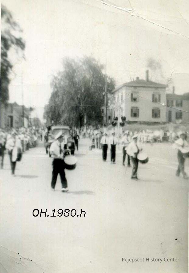 A B/W photograph of a parade in Bath, ME. Not dated.