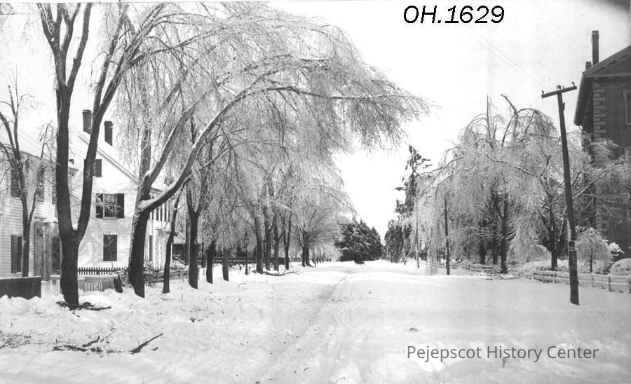 A B/W photographic view of Bath Street, Brunswick, ME with houses, trees bending over with the weight of the ice from the storm of April 2, 1887, and in the far background a horse and wagon.