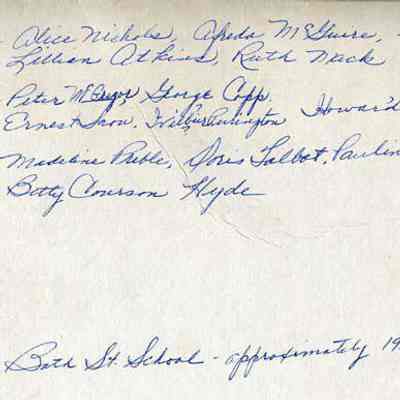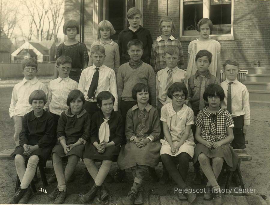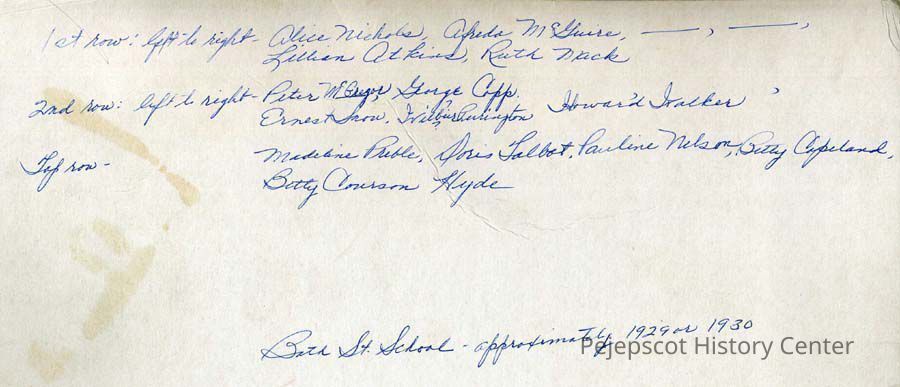 A sepia-toned photo of students of the Bath Street School in Brunswick, Maine taken in 1929 or 1930. The students are identified on the back as: