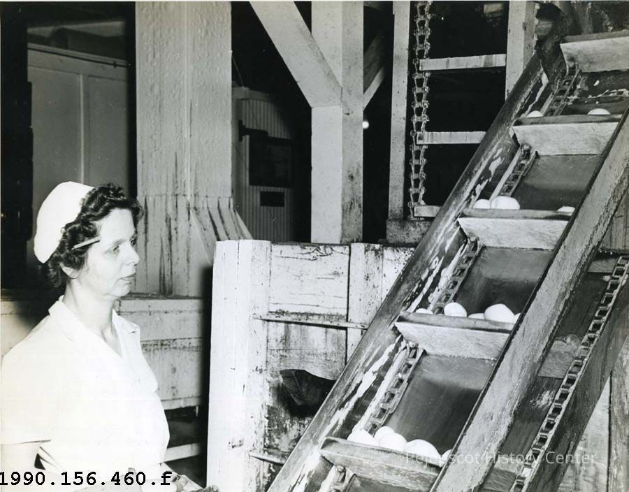 A B/W photograph of potatoes being processed at a Division of Baxter Canning Company, Hartland, Maine. UndatedCollection