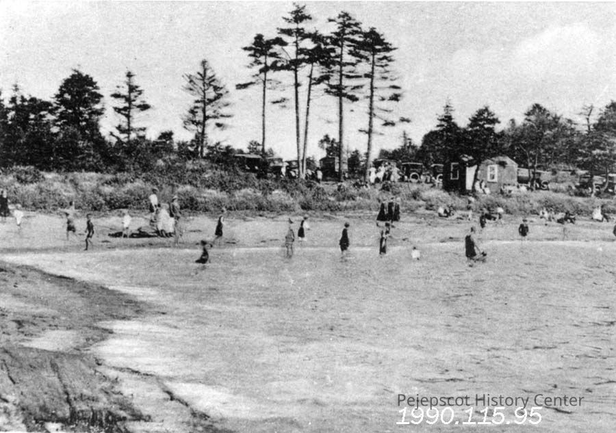 Bathers in the water and on the beach at Sandy Cove, Cundy's Harbor, circa 1930.
