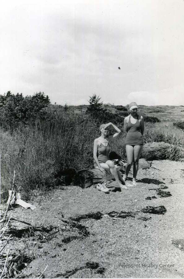A black and white photograph of two women on a beach in Bailey Island. They are identified as Miss Chancy (possibly Clancy) & Miss Ronalder. Dated Aug. 27, 1938.