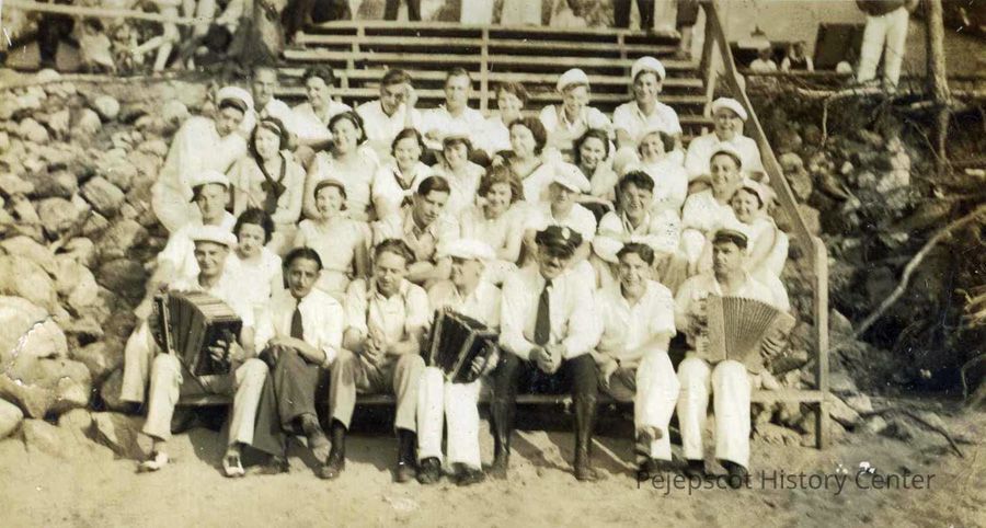 A B/W group photo of people at a beach. The photo is marked, "Bear Pond Picnic, 7/1933".