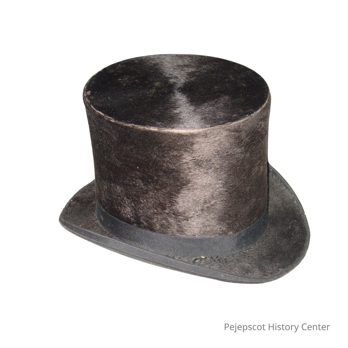 A beaver fur top hat with a black ribbon band and hem along the brim. The hat was manufactured in Lewiston, Maine.