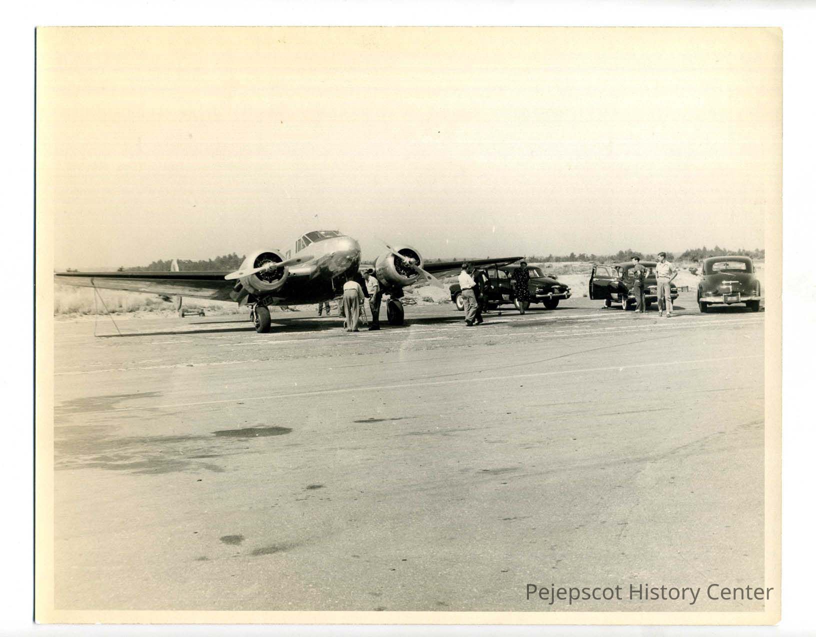 A Beech 18 plane is parked to the side of a runway at Brunswick Naval Air Station. Three cars are parked beside it. Six men and a woman (all civilians) stand around it. Undated