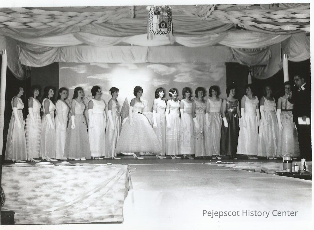 Before naming the five finalist. L. to R., B, Alexander, P. Gladu, B. Bonang, L. Despres, E. Menard, C. Lord, C. Farmer, V. Allard, C. Vroom, K. Slattery, J. Staples, J. Coulombe, M. Abbott, M. Paquette, S. Closson, M. Tomko, and D. Overlook, Bob Dumais M.C. announcing the five finalist.Collection