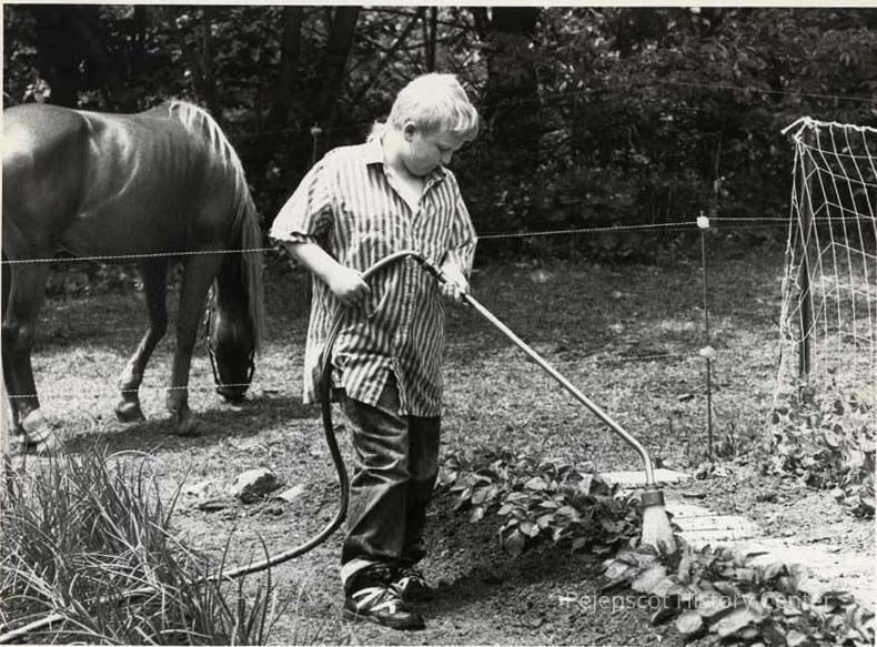 An undated black and white photograph of Ben Whatley working in his garden in Topsham, Maine.