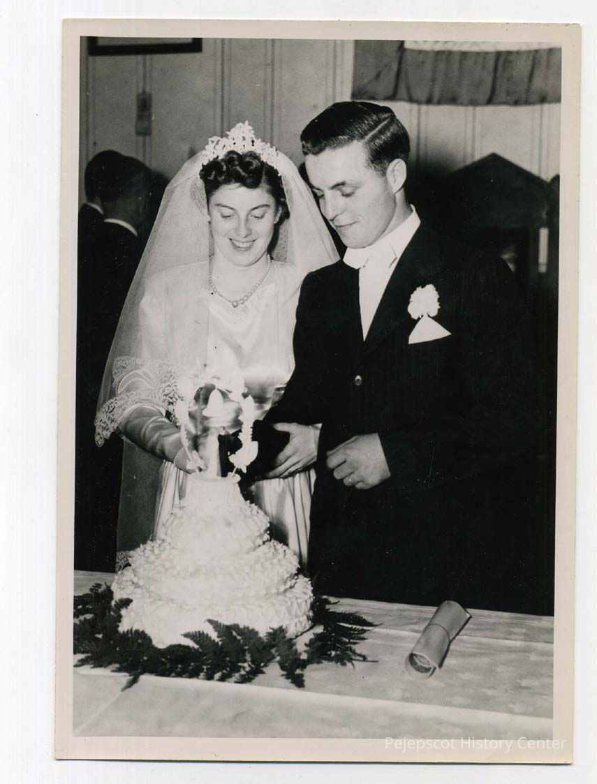 Muriel Constance Bernier and Jean Paul Roy cutting the cake at their St. John's church wedding. 02/23/1946