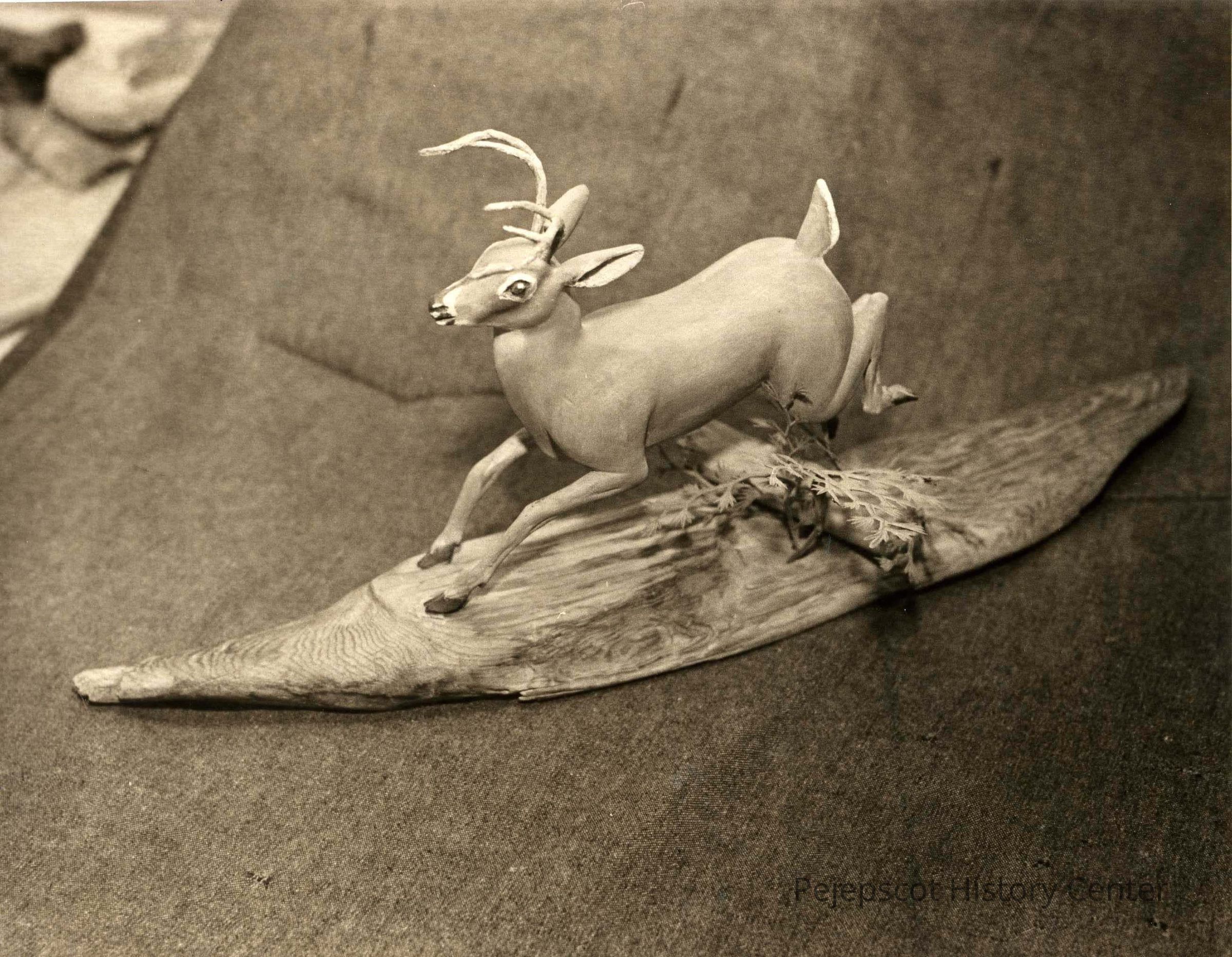 A black and white photo of a wooden deer, carved by Elmer Berquist of Topsham, appeared in The Times Record in Brunswick, Maine, on 4/6/1981, accompanying an article about his wood carvings.