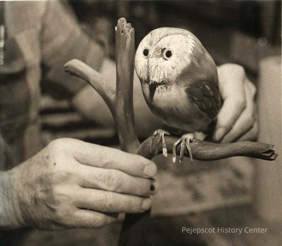 A black and white photo of Elmer Berquist of Topsham placing an owl he carved out of wood on its perch appeared in The Times Record in Brunswick, Maine, on 4/6/1981.