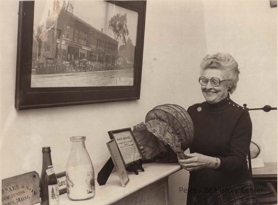 An undated black and white photo of Elizabeth D. "Bette" Copeland was taken in the research room of the Pejepscot Historical Society building on Park Row in Brunswick, Maine. Bette's obituary is included in the Notes.