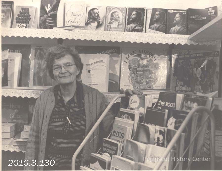 A B/W photograph of Betty Moody manager of the Innkeeper Christian Bookstore on Bath Road. Photo published 2/27/1976. Undated