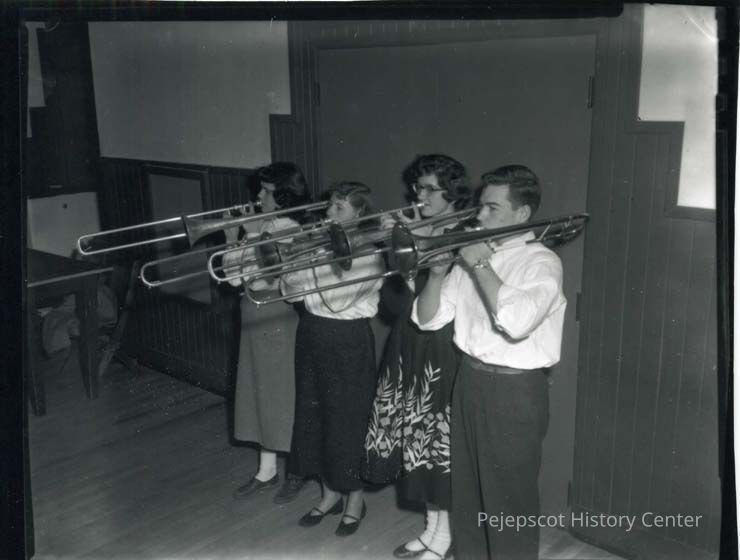 The BHS Band trombonists on March 25, 1955; Carolyn Estes, Carol Koerber, Ann Snow, and Bob Sweet.