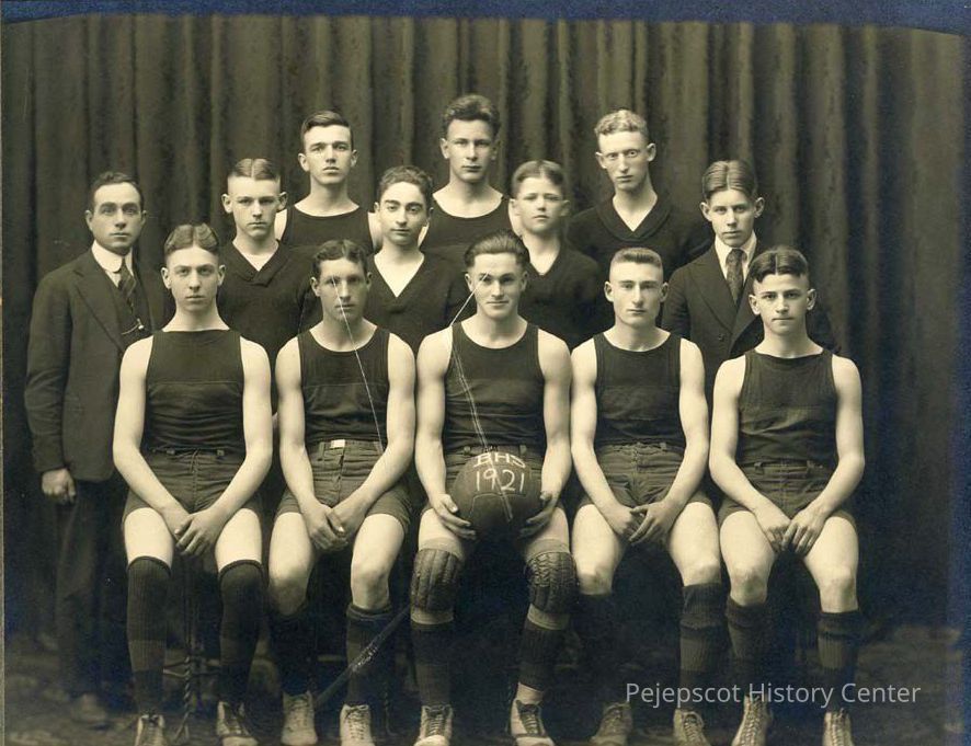 Black & white photograph of the Brunswick High School basketball team, dated to 1921. The basketball held in the middle of the 1st row says, "BHS 1921."
