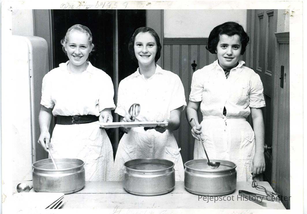 Brunswick High School cafeteria workers in September 1959. The picture shows three girls only one of whom is identified. Sandy Rollins ( on left) was murdered and later found in a Topsham pit; Gloria ?; Eva ?.