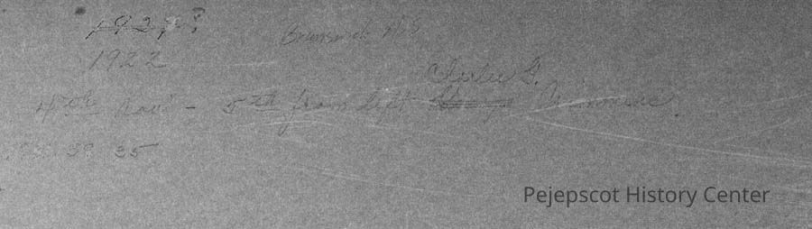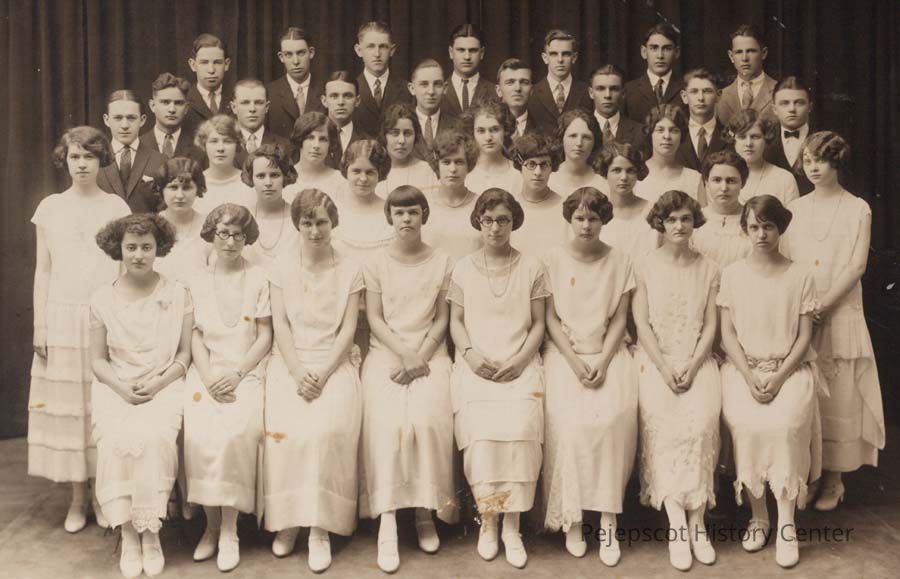 A B/W photograph of the graduating Brunswick High School class of 1922 (?). One person is identified, stated on the back of the photo as, "4th row, fifth from the left, Charles G. Crimmins."Collection