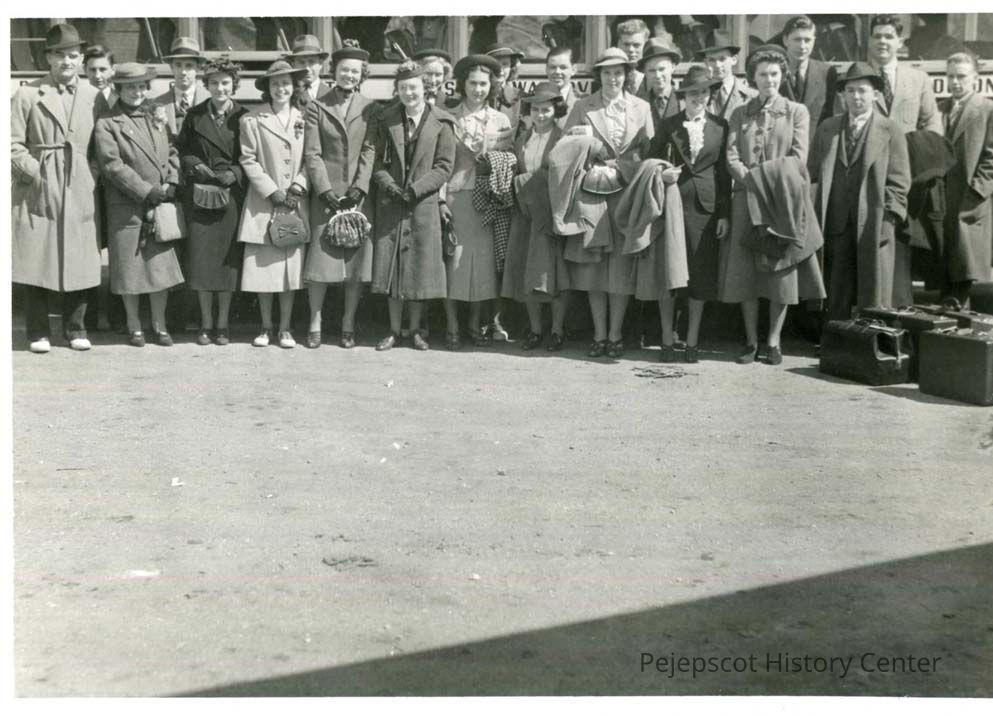 A group of BHS students in the 1930s or 40s possibly about to leave for a class trip. French Club. Front row first on left -- Mr. Lapointe, French teacher; third from left, Charlotte Guptil; fifth from left, Florence Atwood; seventh from left, Anita Raymond Hill; eighth from left Priscilla Bernier. Second row -- behind Priscilla Bernier, George Paiement; second from right, Claude St. Pierre; first on left, Herb Melhorn. UndatedLexicon