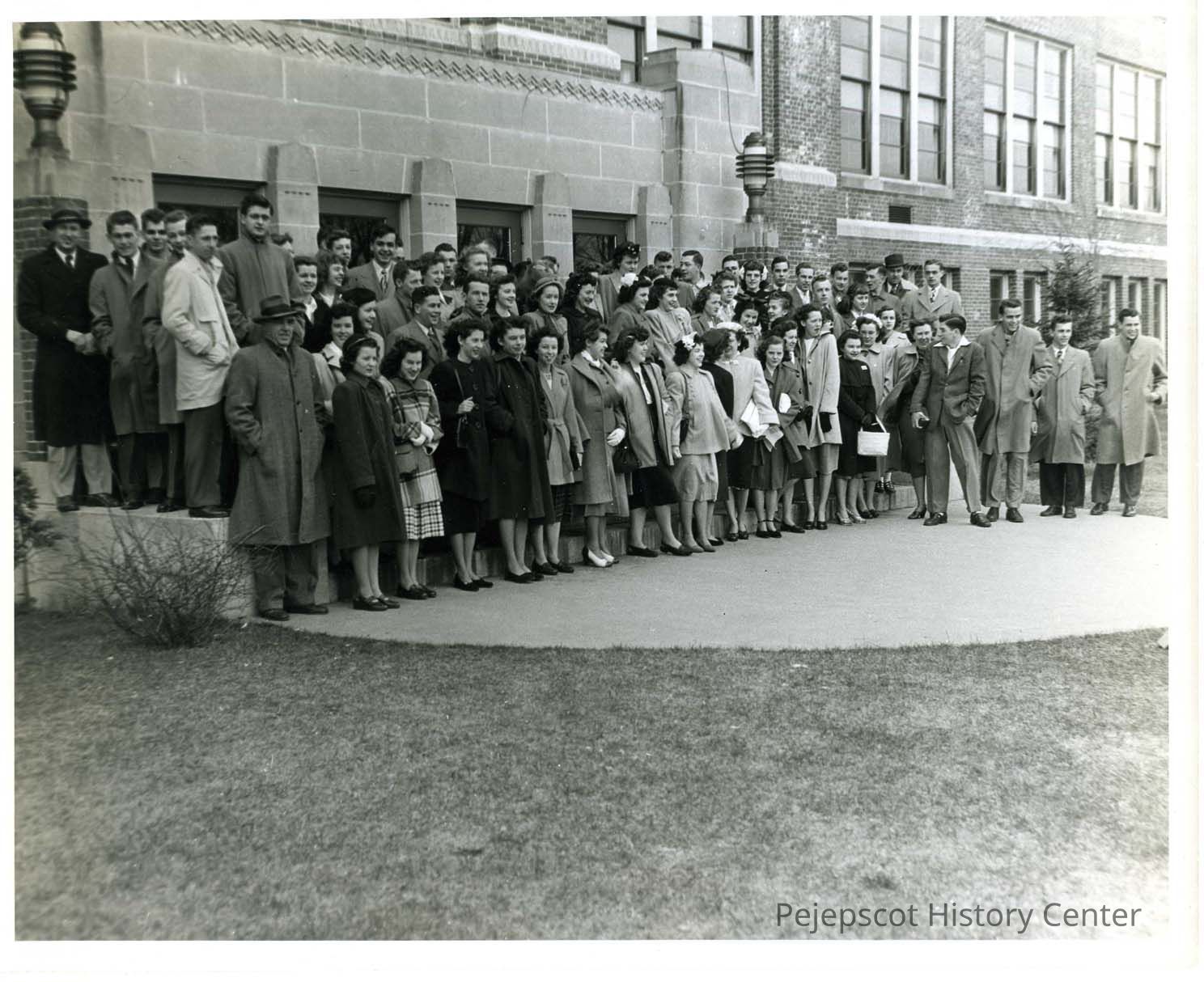 A Brunswick High School class of students stand on the front steps of the school just before leaving on the class trip to Washington, D.C. George Crimmins is the teacher on the left. Undated