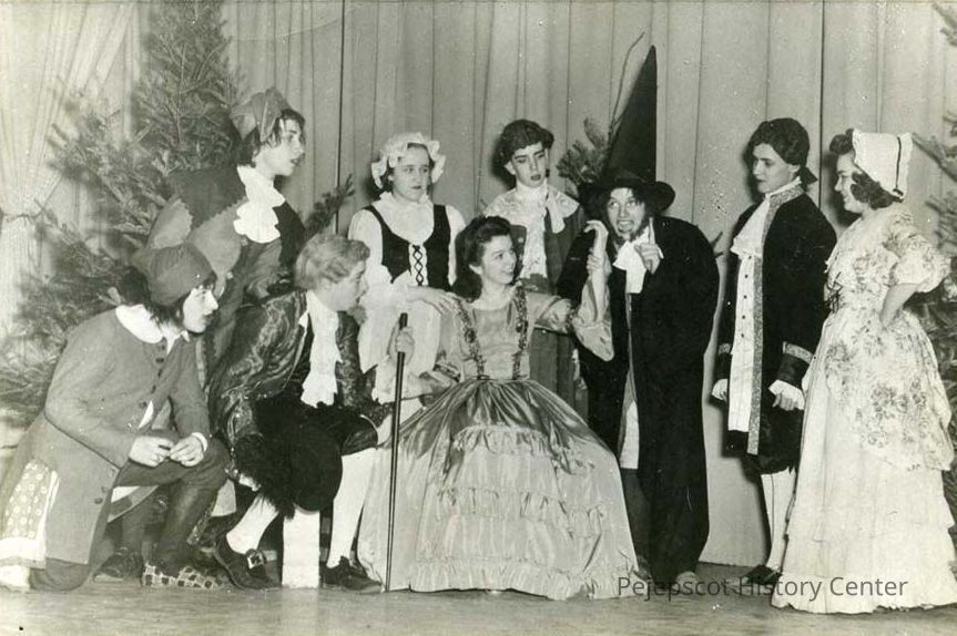Black & white photograph of the Brunswick High School Dramatics Class in 1942, either a performance or a dress rehearsal. There is an unadorned Christmas tree on the left. Dated circa 1942.