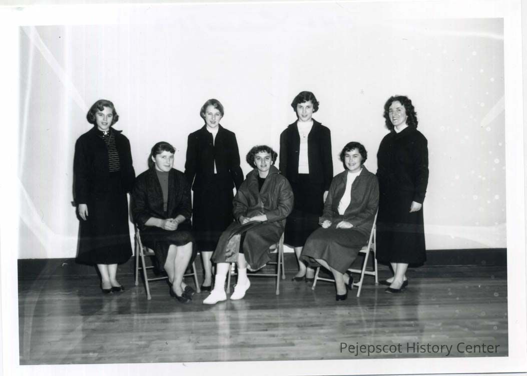 Seven girls form BHS Fashions Class pose for the camera. They may be modeling clothing they made in lcass.